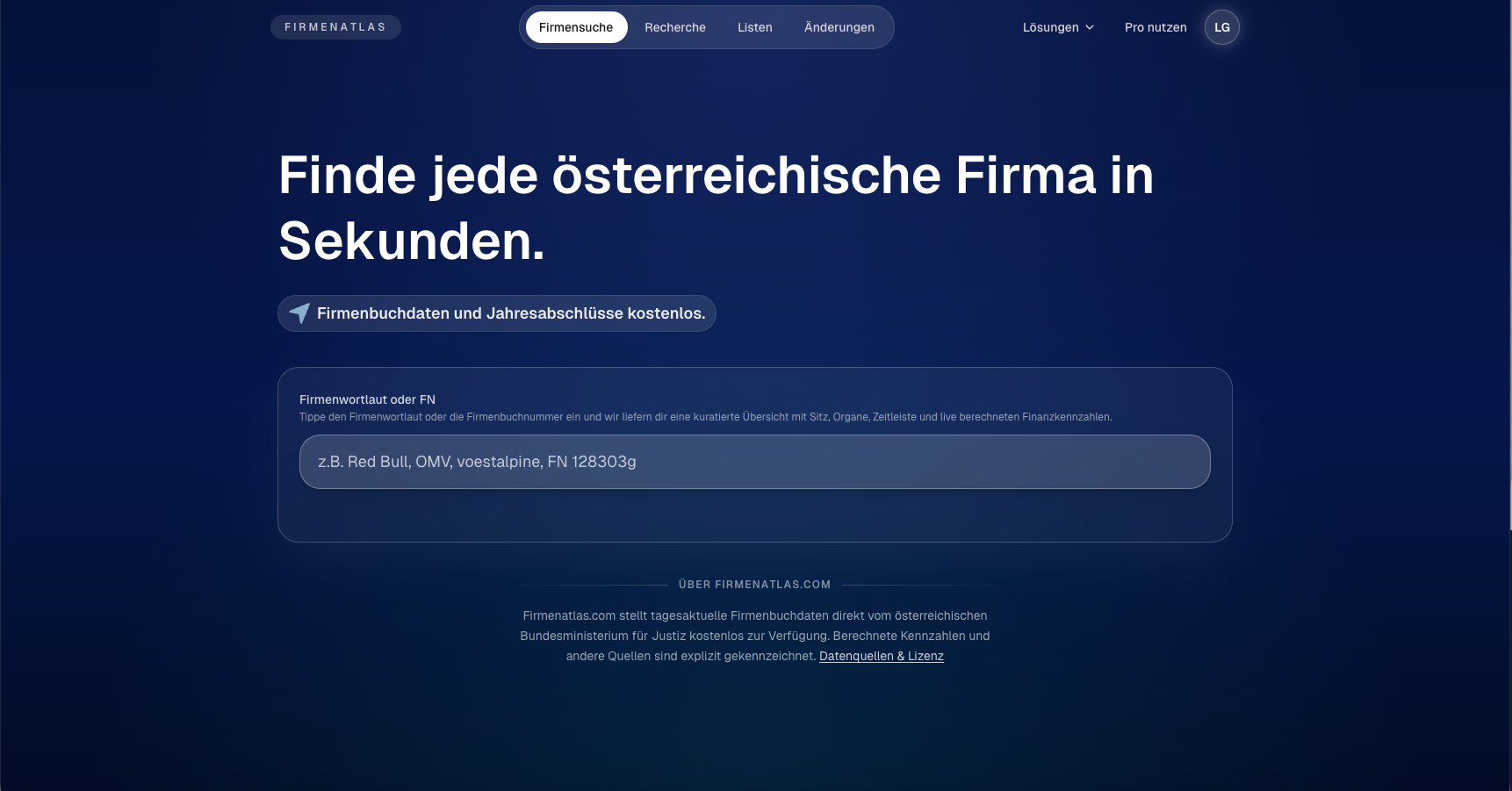 Firmenbuchdaten und Jahresabschlüsse österreichischer Unternehmen — Daten, die früher kostenpflichtig waren, jetzt kostenlos und tagesaktuell. Firmenatlas synchronisiert direkt mit dem Bundesministerium für Justiz. Eingesetzt in Vertrieb, Compliance, Finance und M&A.